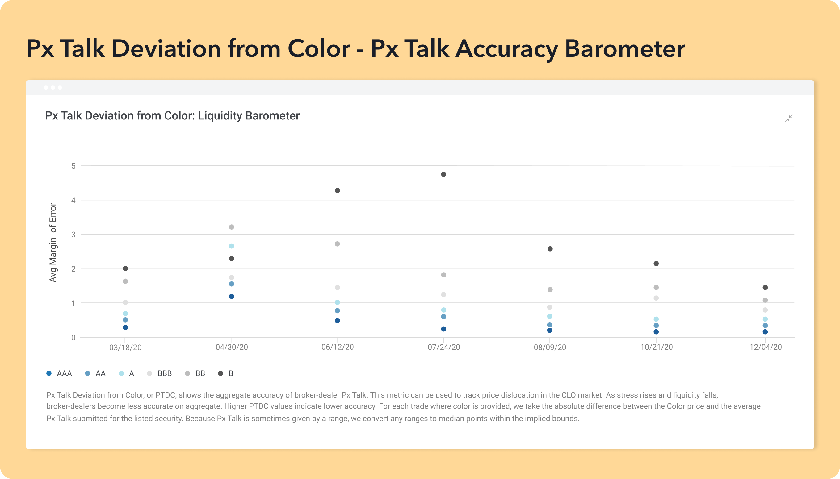 Average Px Talk Deviation from Color (PTDC) is a measure of aggregate broker-dealer Px Talk accuracy. For each trade where color is provided, we find the absolute error between the actual color price and the average Px Talk value across dealers. The higher the value, the less accurate dealers are in predicting actual prices at that point in time. The higher the error value, the less liquid the market.