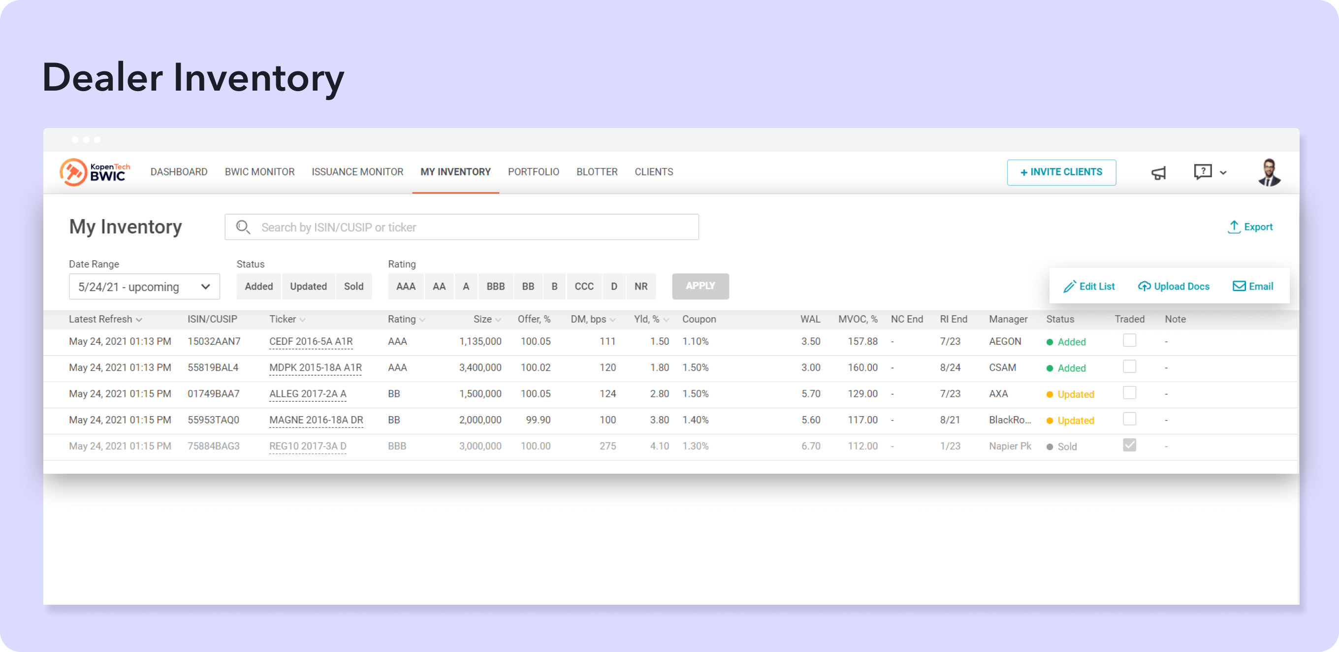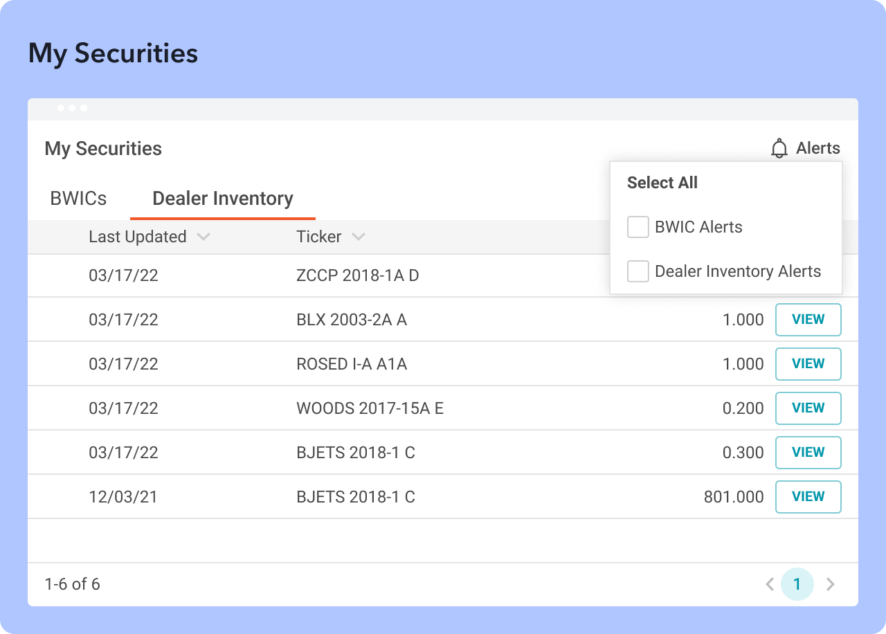 Portfolio securities available in Dealer Inventory are added as a separate widget on Dashboard page. Turn on BWIC & Dealer Inventory alerts to stay tuned on activity in your portfolio.