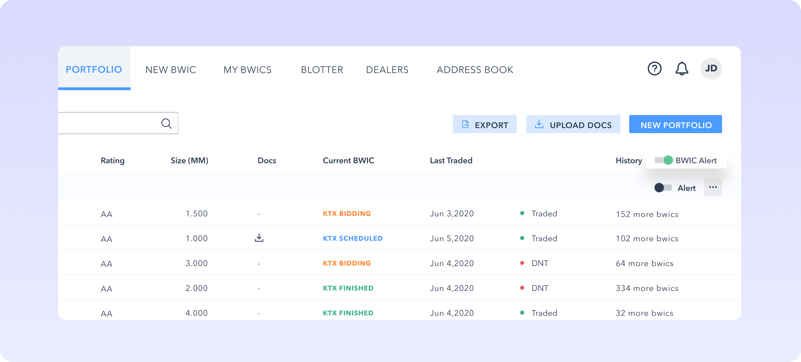 Get notified when securities from your portfolio are on an upcoming BWIC. Toggle on an alert for all portfolios or for a specific portfolio.