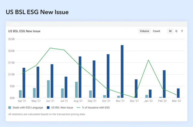 1. ESG Deals as a % of the US BSL New Issue shows monthly breakdown and users can specify timeframe US BSL ESG issuance broken down by months. 2. Static Deals table lists static deals. Users can select YTD or a specific year. 3. Debut Deals table lists new managers entering CLO space. Users can select YTD or a specific year.