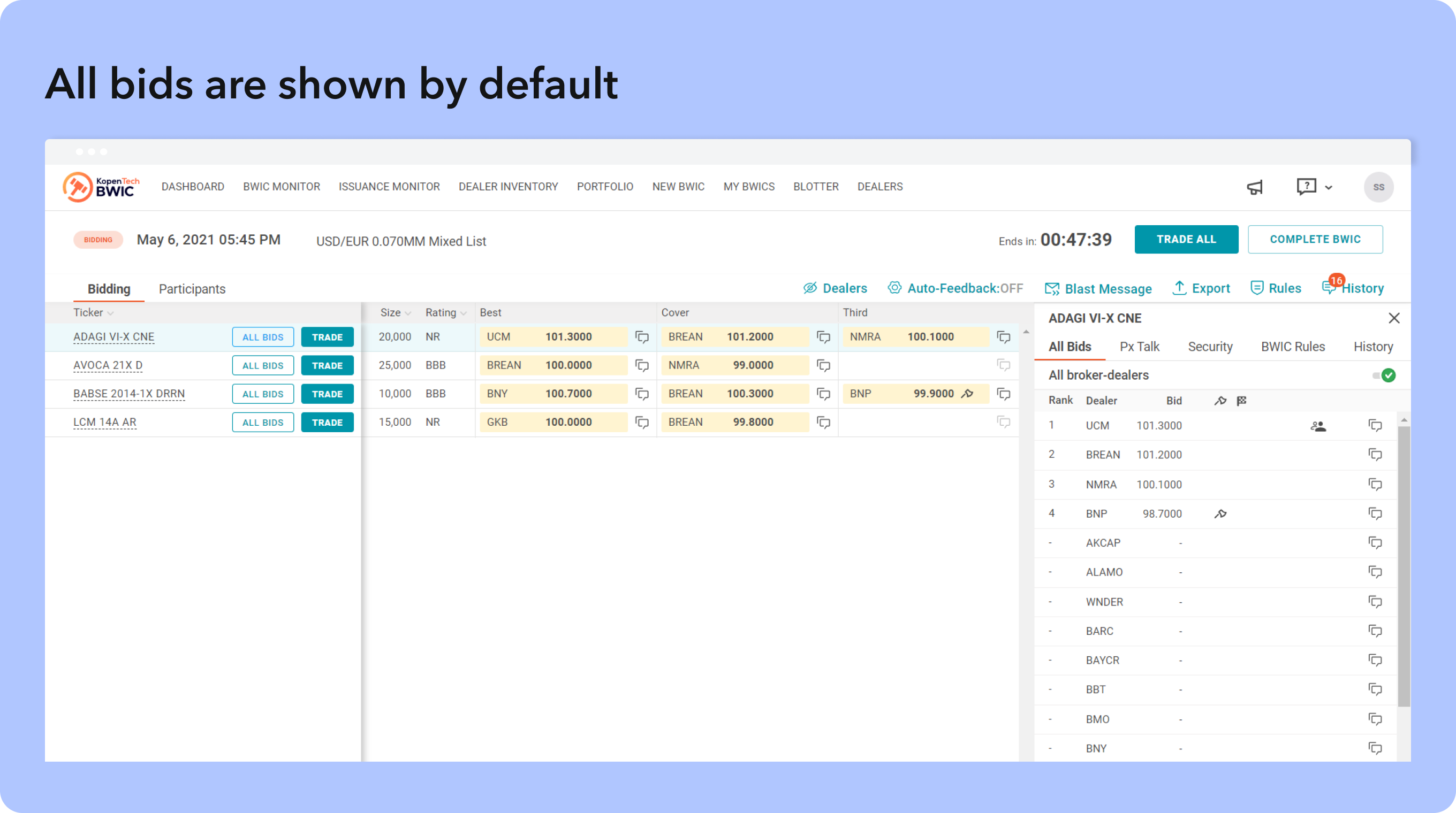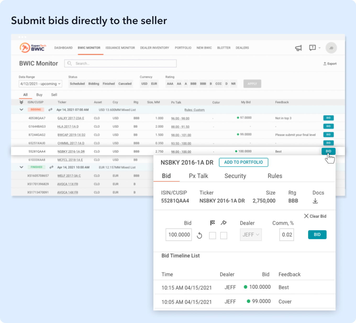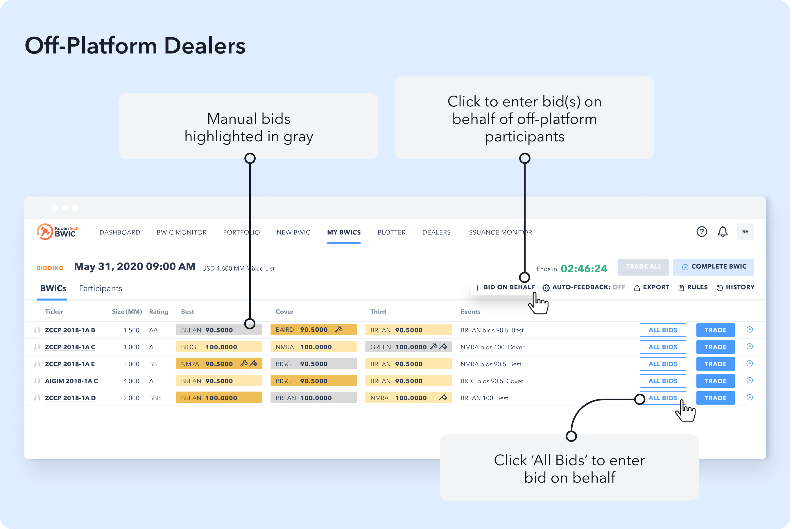 My BWICS shows any BWICs you scheduled as a seller. My Bids shows any bids you placed on the upcoming BWICs via KopenTech’s multi-dealer bidding platform.