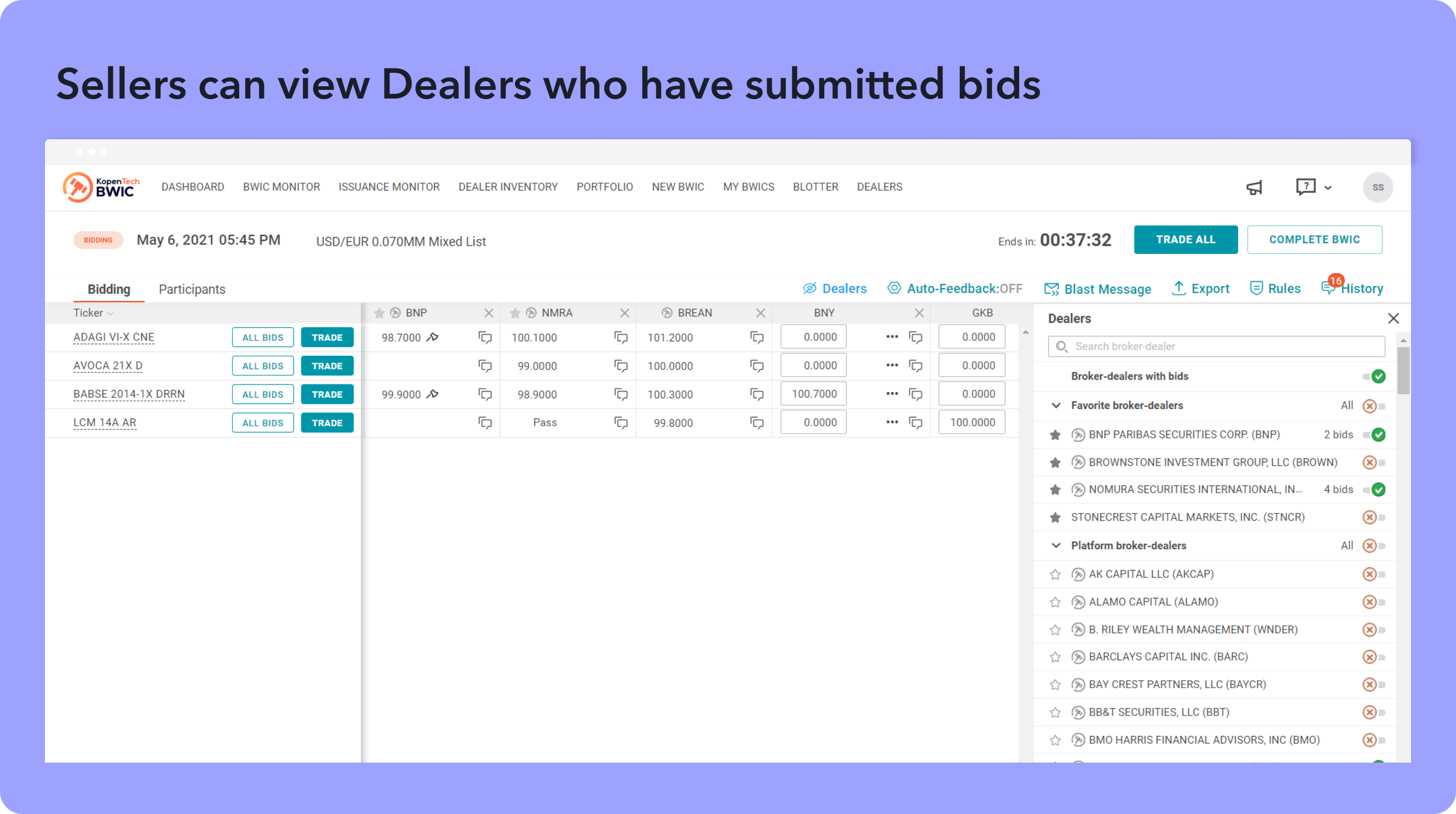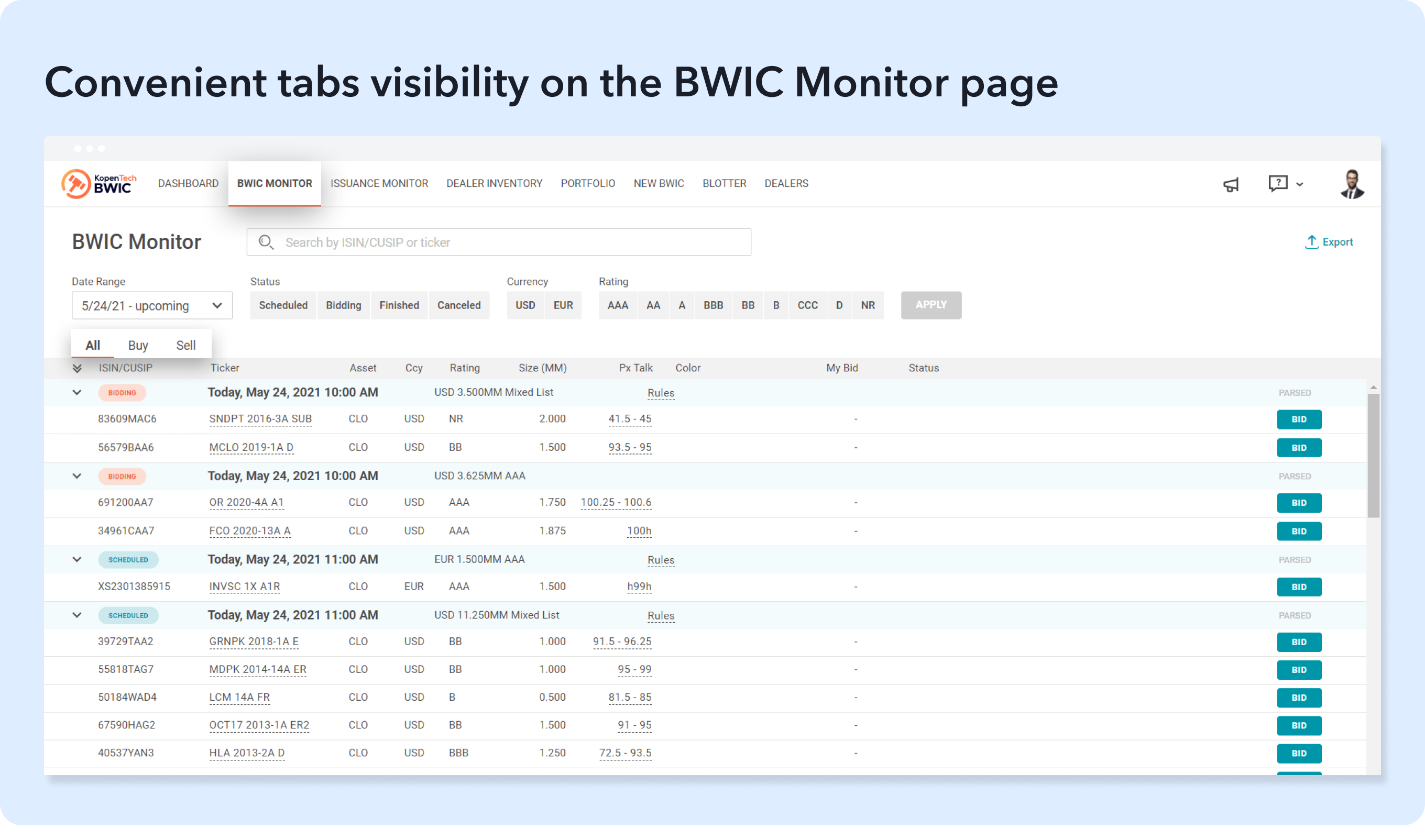 The BWIC Monitor now has 3 tabs for sellers and 2 tabs for dealers for easier navigation: