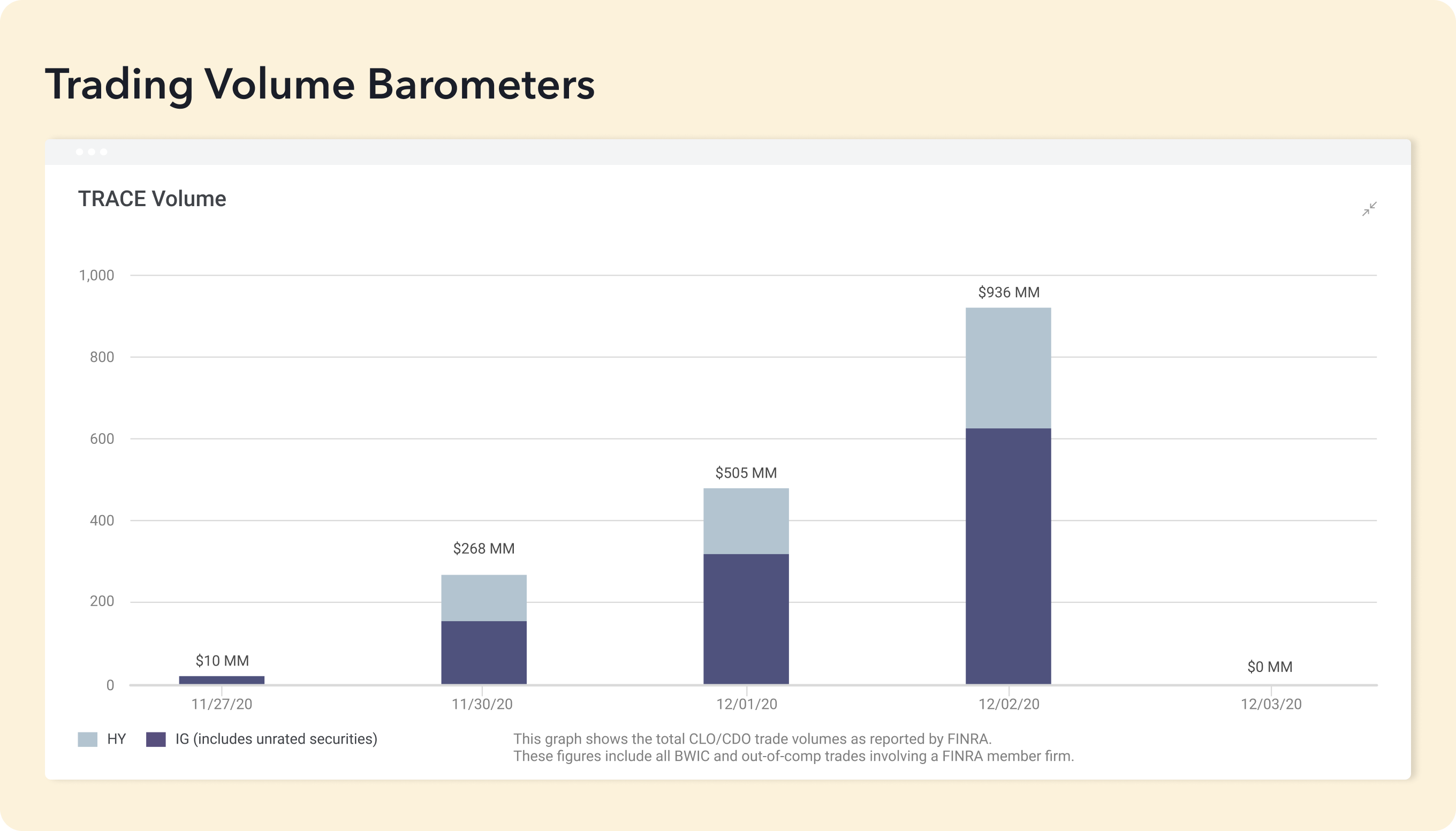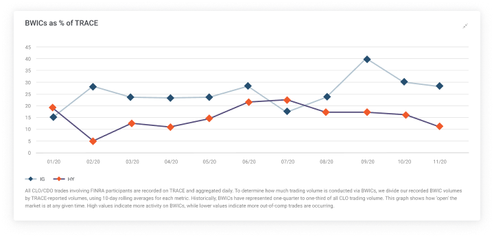 FINRA’s TRACE data are comprised of daily BWIC trades as well as bilateral activity broken down between IG and HY.