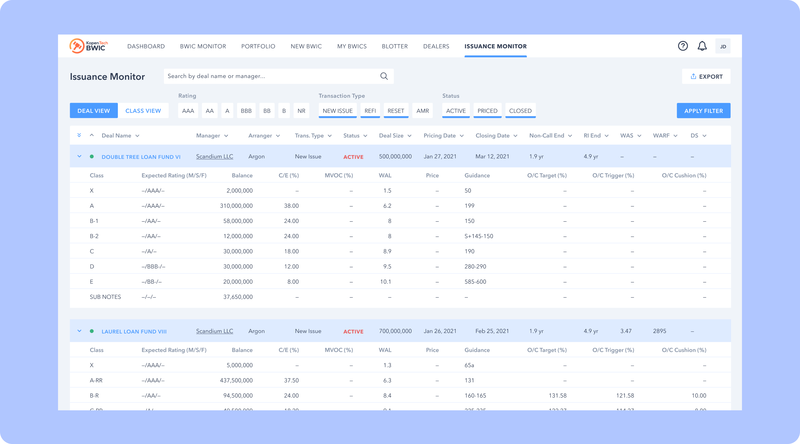 Within Issuance Monitor, users can add/remove columns with relevant information and to save these views for future use. Column customization is available for both Deal View (entire CLO capital structure) and Class View (tranche-specific information).
