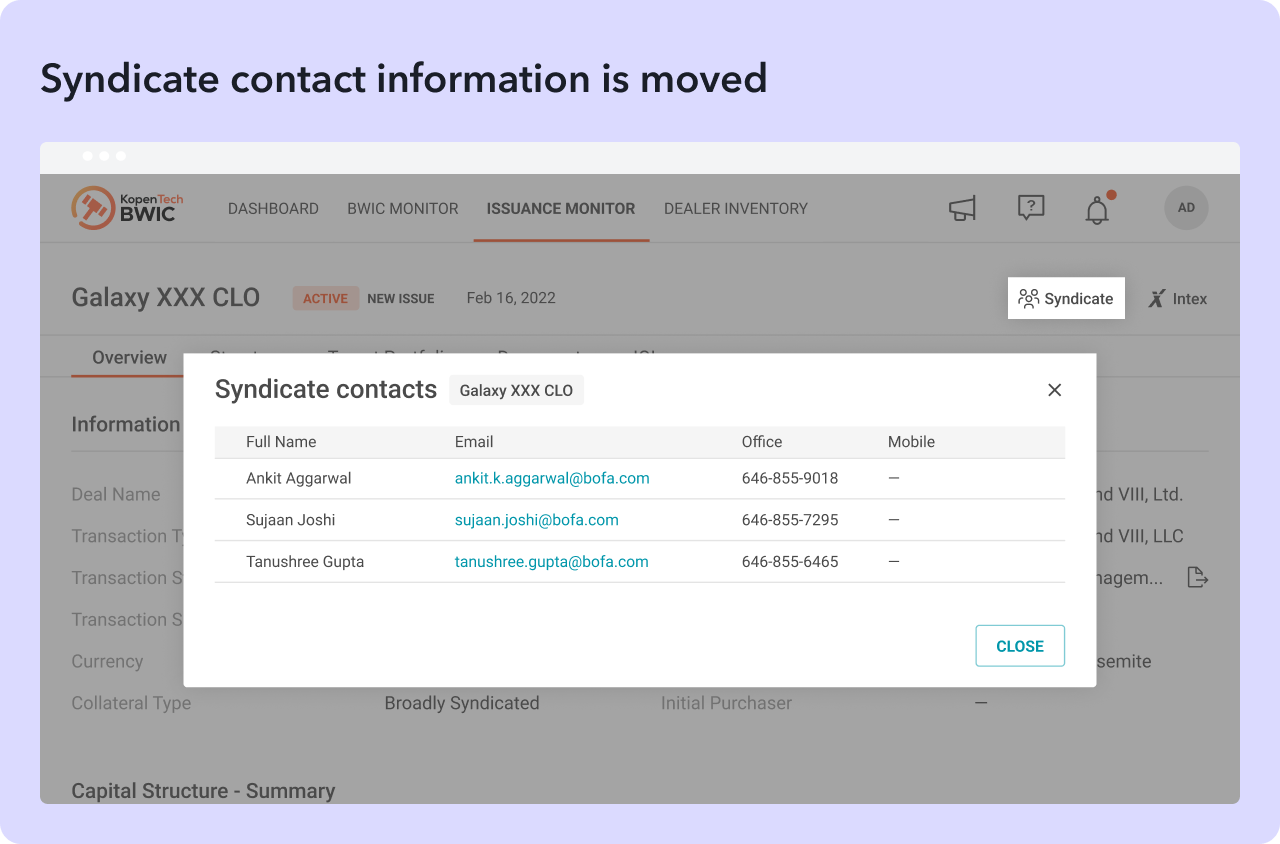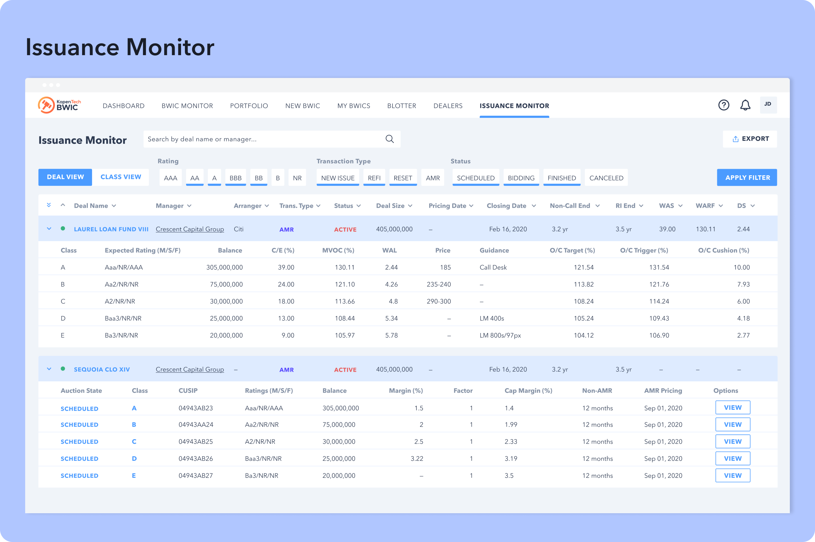 It’s a centralized portal for all primary activity: new issues, refis and resets. With this portal, our objective is to have a centralized location and standardized approach to collecting deal information. When you arrive on the Issuance Monitor page, you’ll immediately see similar filters to the BWIC monitor. Advanced filtering tools are available to allow focus on specific transaction types, ratings, reinvestment, or non-call periods along with 15 other portfolio characteristics. Investors will be able to access granular deal details in five intuitive sections.