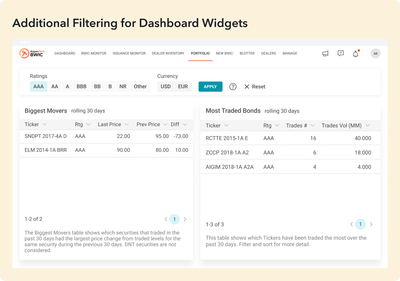 Filters by currency and rating are now available for Biggest Movers and Most Traded Bonds widgets on Dashboard.