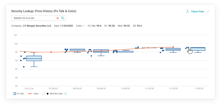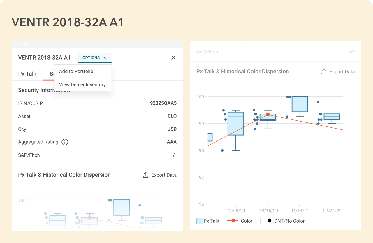 Complete CLO secondary marketplace: access dealer price talk and color. Export, search or filter data for your own analysis. Historical data: explore data for the last six years. See security information, up-to-date rating and graphical representation of historical px talk & color.