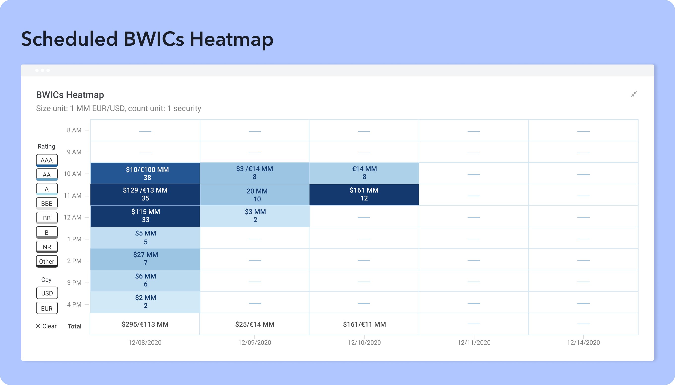 Our heatmap enables investors to visualize upcoming BWICs through colored tiles. The tiles are colored more intensely when larger notional is scheduled and the number of securities is displayed next to volume. The heatmap helps both buyers and sellers to schedule their participation. Sellers can avoid busy periods to get better participation from broker-dealers.