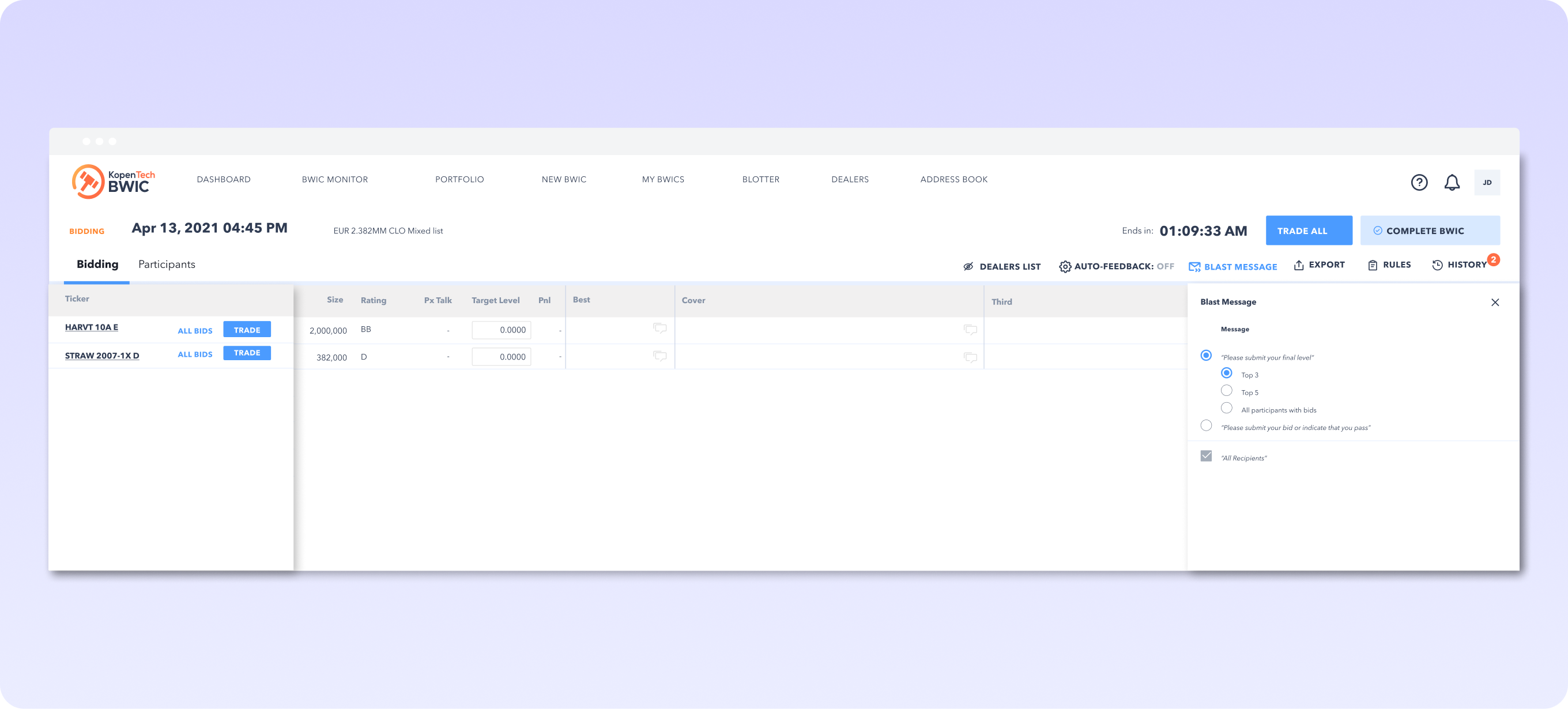 DirectBidding is a trading protocol where CLO buy-side investors negotiate directly and trade anonymously. Access CLO liquidity from broker-dealers and the buy-side simultaneously. Send a BWIC to 150+ buy side firms, 30+ broker-dealers, or both in one trading session.