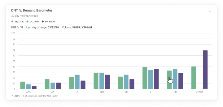 The Did Not Trade (DNT) rate is a widely-used measure of demand. It is the percentage of bonds that were sent out on BWICs and tagged DNT, meaning "did not trade," or no trade agreement was reached. The higher the value, the less implied liquidity exists in the market.