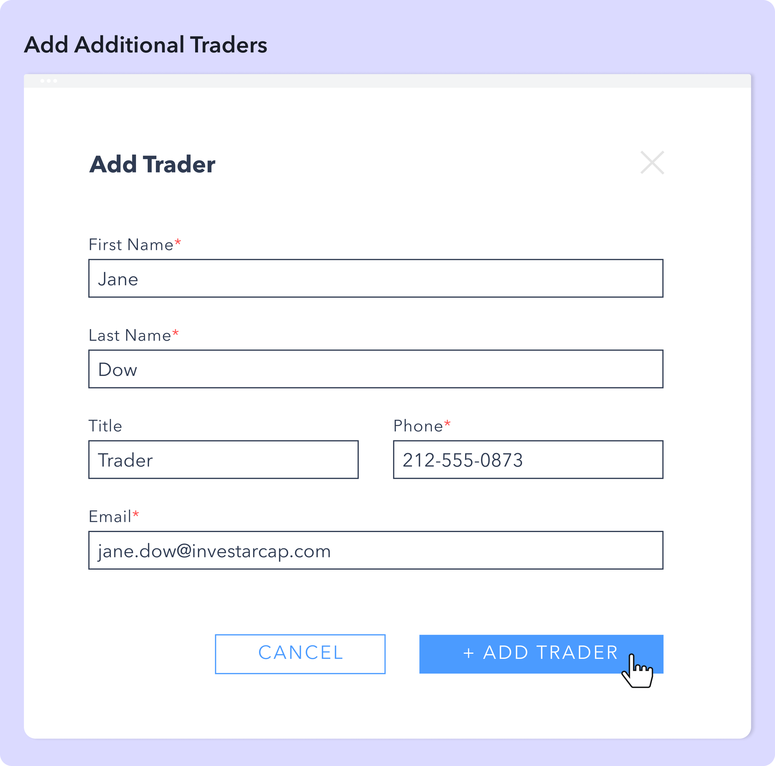 Add your ops, compliance, billing, and other company contacts for streamlined communication.
